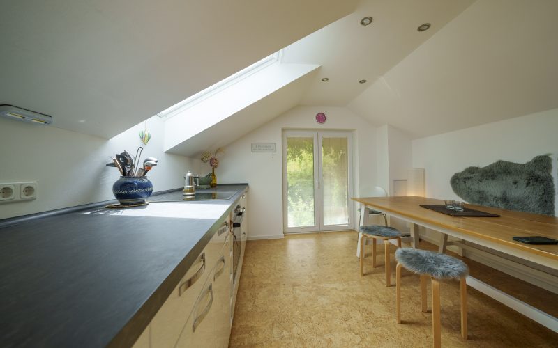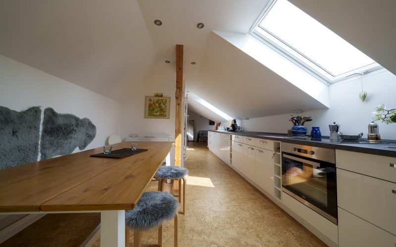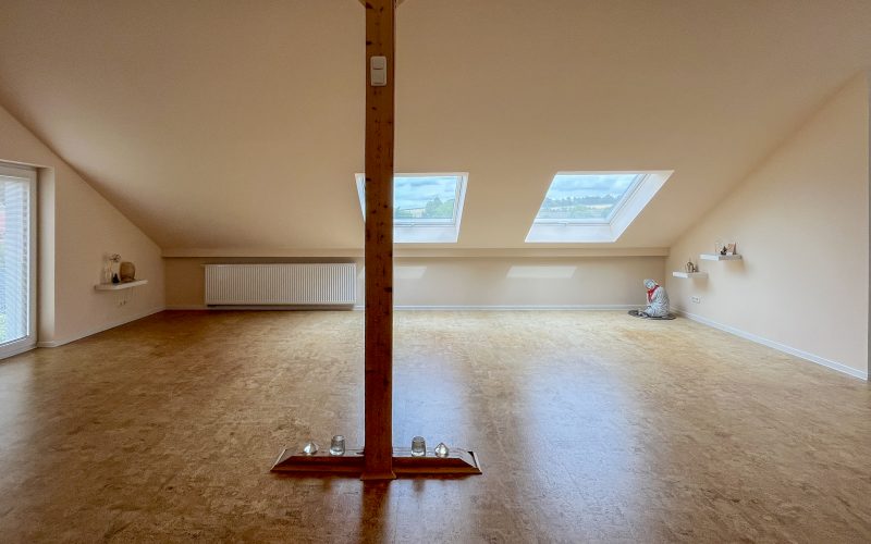 Ein Highlight für Individualisten. 2018 vollständig neu und stilvoll ausgebaut, präsentiert sich das Dachgeschoss lichtdurchflutet, modern und offen. Mit hochwertiger Dämmung, neuwertigen Fenstern, Sichtbalken und einem klaren architektonischen Konzept eignet sich diese Etage nicht nur als Wohneinheit, sondern auch als Seminarraum, Atelier, Yogastudio, Therapiezentrum oder exklusive Studiowohnung. Der Fernblick durch die großzügigen Fensterflächen inspiriert – Tag für Tag.