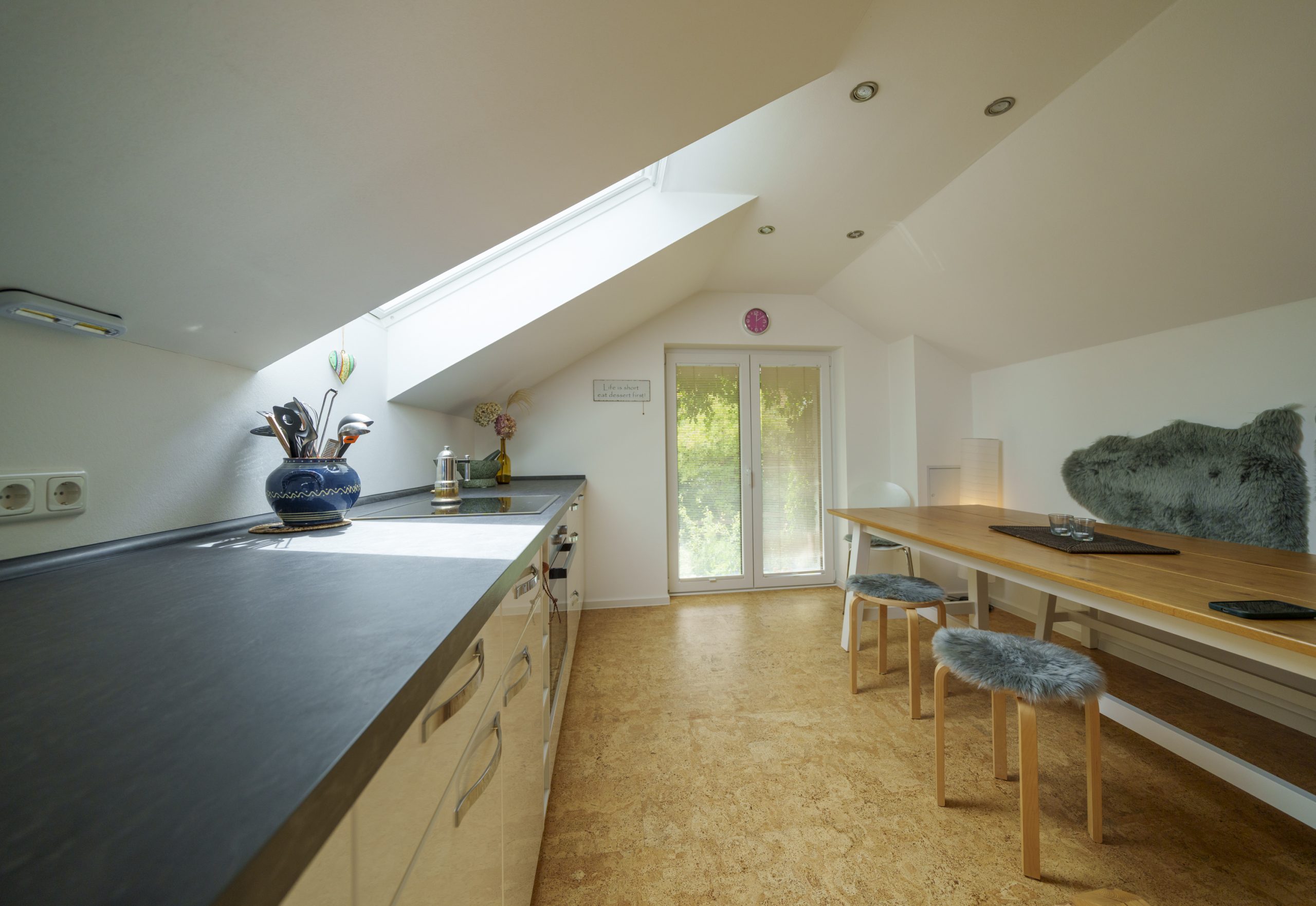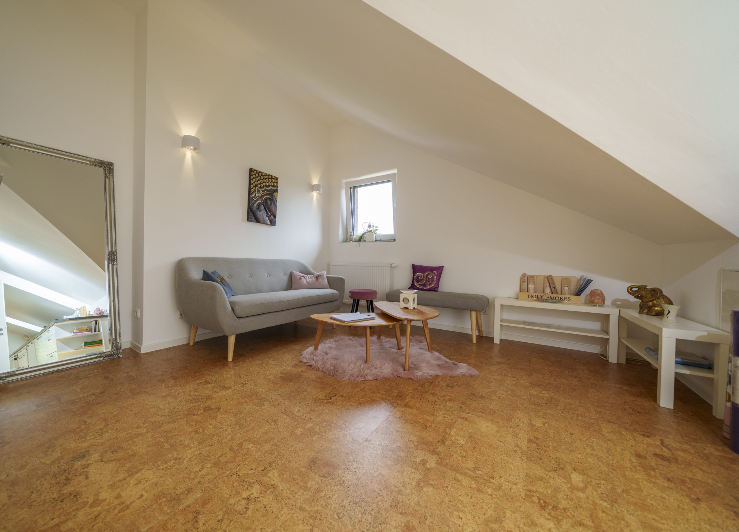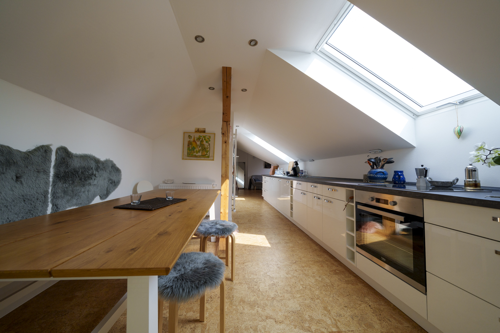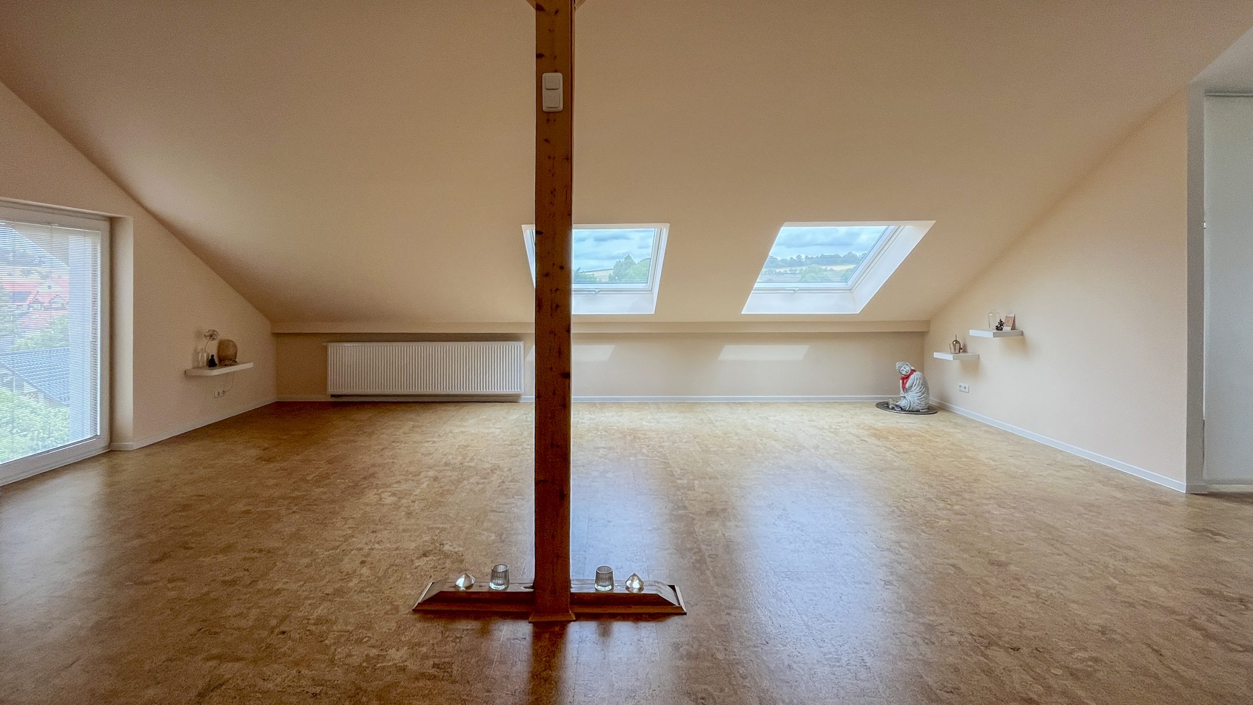 Ein Highlight für Individualisten. 2018 vollständig neu und stilvoll ausgebaut, präsentiert sich das Dachgeschoss lichtdurchflutet, modern und offen. Mit hochwertiger Dämmung, neuwertigen Fenstern, Sichtbalken und einem klaren architektonischen Konzept eignet sich diese Etage nicht nur als Wohneinheit, sondern auch als Seminarraum, Atelier, Yogastudio, Therapiezentrum oder exklusive Studiowohnung. Der Fernblick durch die großzügigen Fensterflächen inspiriert – Tag für Tag.