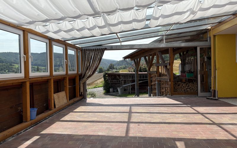 Die solide Bauweise – massive Außenwände aus 30 cm Poroton, verputztes Ziegelmauerwerk, Satteldach mit langlebigen Betonziegeln – sowie gut erhaltene Fenster aus den 1980er Jahren bilden eine verlässliche Grundlage für viele weitere Jahrzehnte. Einige Rollläden im Erdgeschoss des Wohnhauses, teilweise elektrisch, und ein neu installierter Glasfaseranschluss mit zukunftsfähiger Internetverbindung runden den Komfort ab.