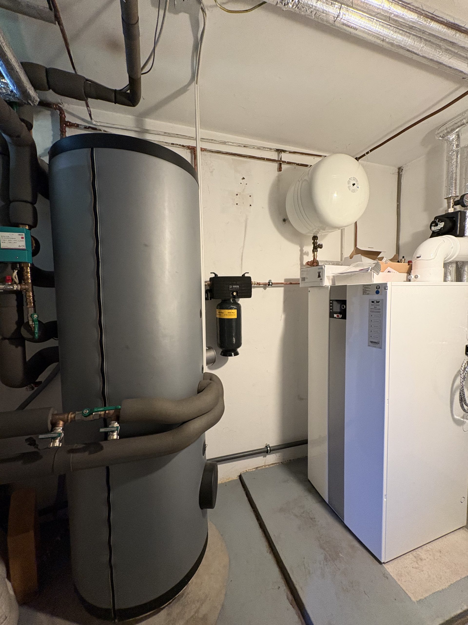 Ein moderner Ölbrennwertkessel der Firma Wolf aus 2024 mit 300-Liter-Warmwasserspeicher, doppelwandigen 1.000-Liter-Tanks (drei Stück) mit Stahlauffangwanne, sorgt für effiziente, unabhängige Wärmeversorgung.