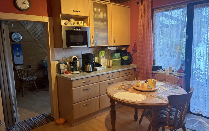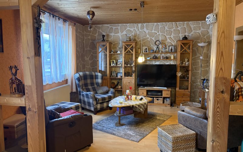 Im Erdgeschoss befinden sich des Weiteren ein großes, gemütliches Wohnzimmer mit freiliegenden Holzbalken, die dem Raum eine warme und wohnliche Atmosphäre verleihen. Eine Küche mit Einbauküche sowie ein separates Esszimmer befinden sich ebenfalls im Erdgeschoss.