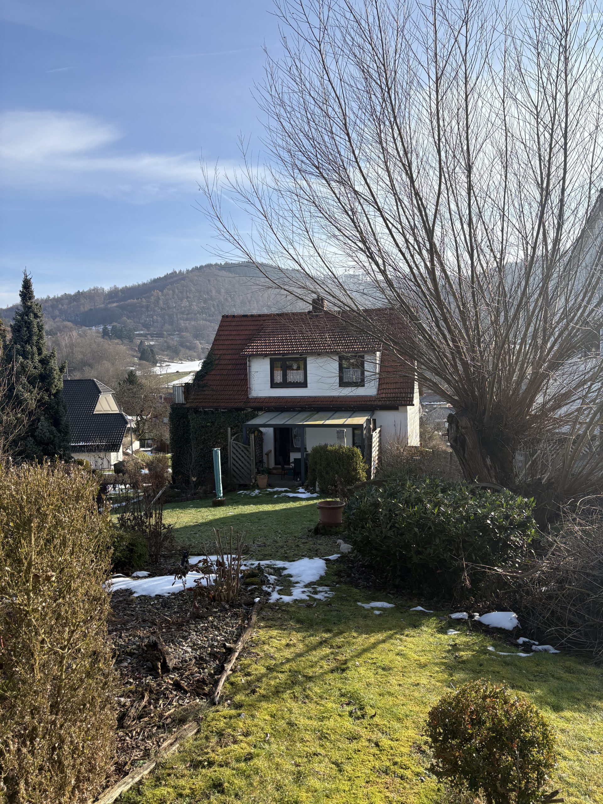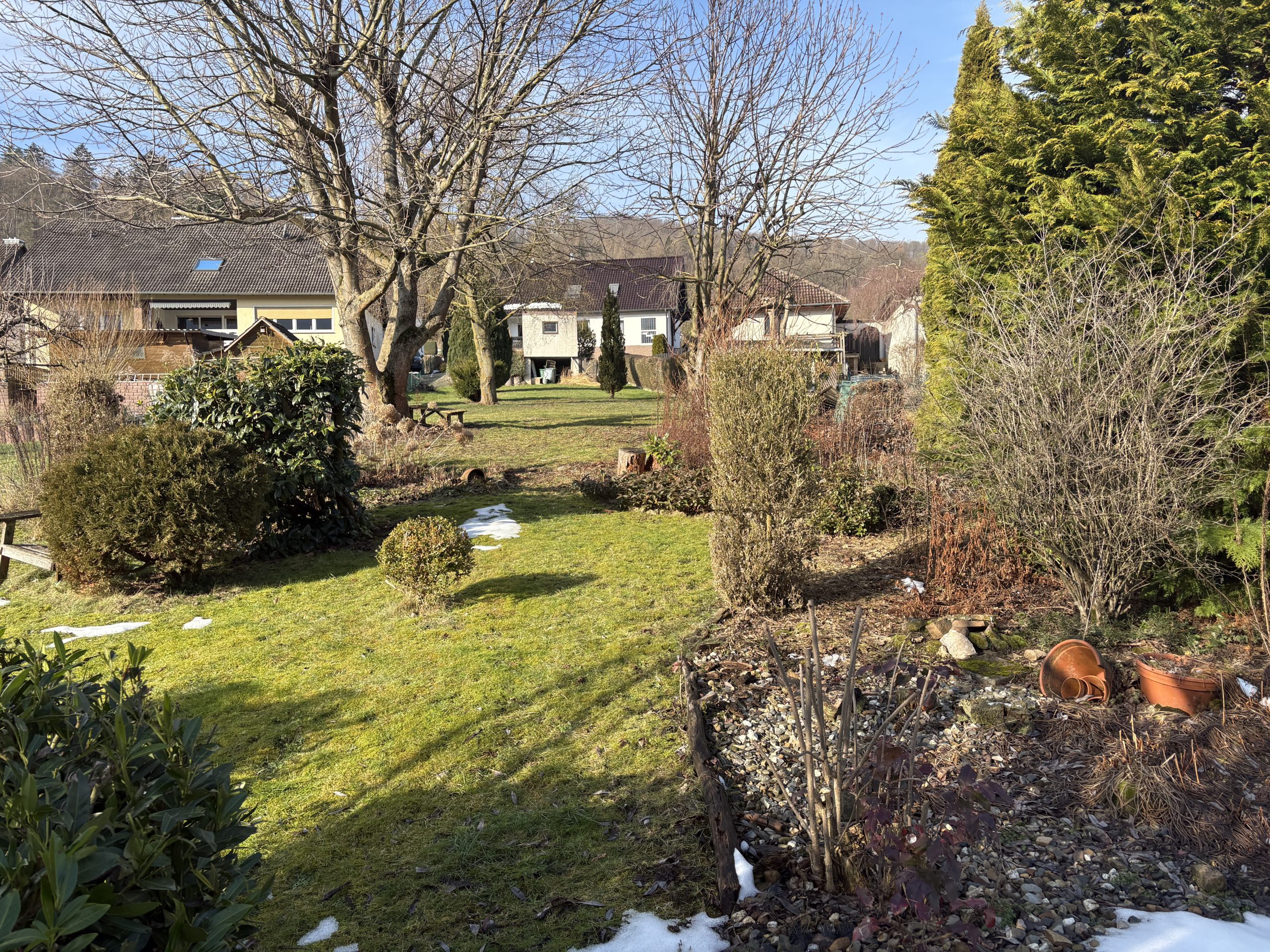Das Haus befindet sich in einer ruhigen Wohngegend in angenehmer Höhenlage und überzeugt insbesondere durch sein weitläufiges, wunderschön angelegtes Grundstück mit Wiese, Büschen, Sträuchern und Baumbestand – ein echtes Paradies für Gartenliebhaber, Selbstversorger oder Familien mit Kindern.