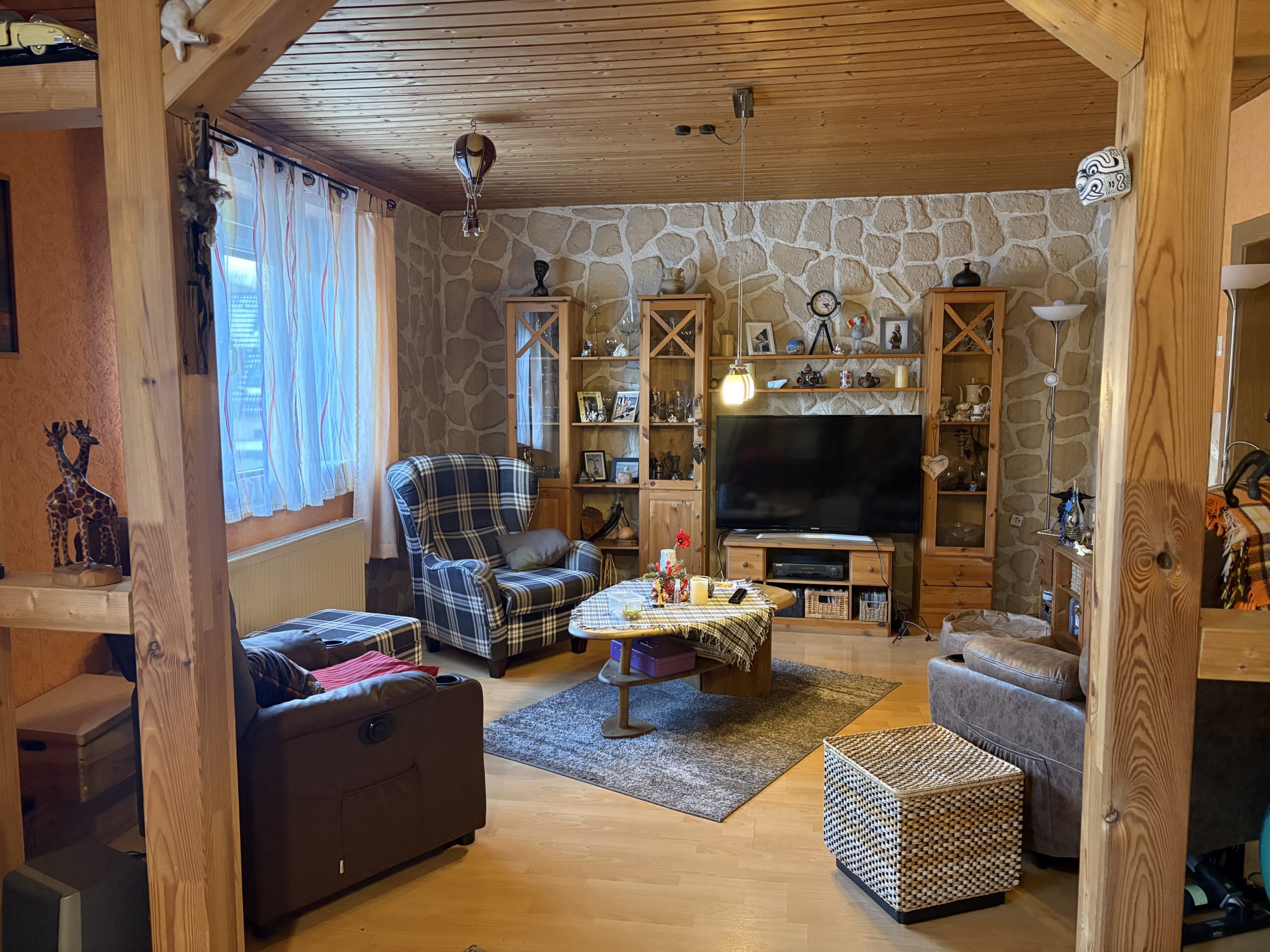Im Erdgeschoss befinden sich des Weiteren ein großes, gemütliches Wohnzimmer mit freiliegenden Holzbalken, die dem Raum eine warme und wohnliche Atmosphäre verleihen. Eine Küche mit Einbauküche sowie ein separates Esszimmer befinden sich ebenfalls im Erdgeschoss.