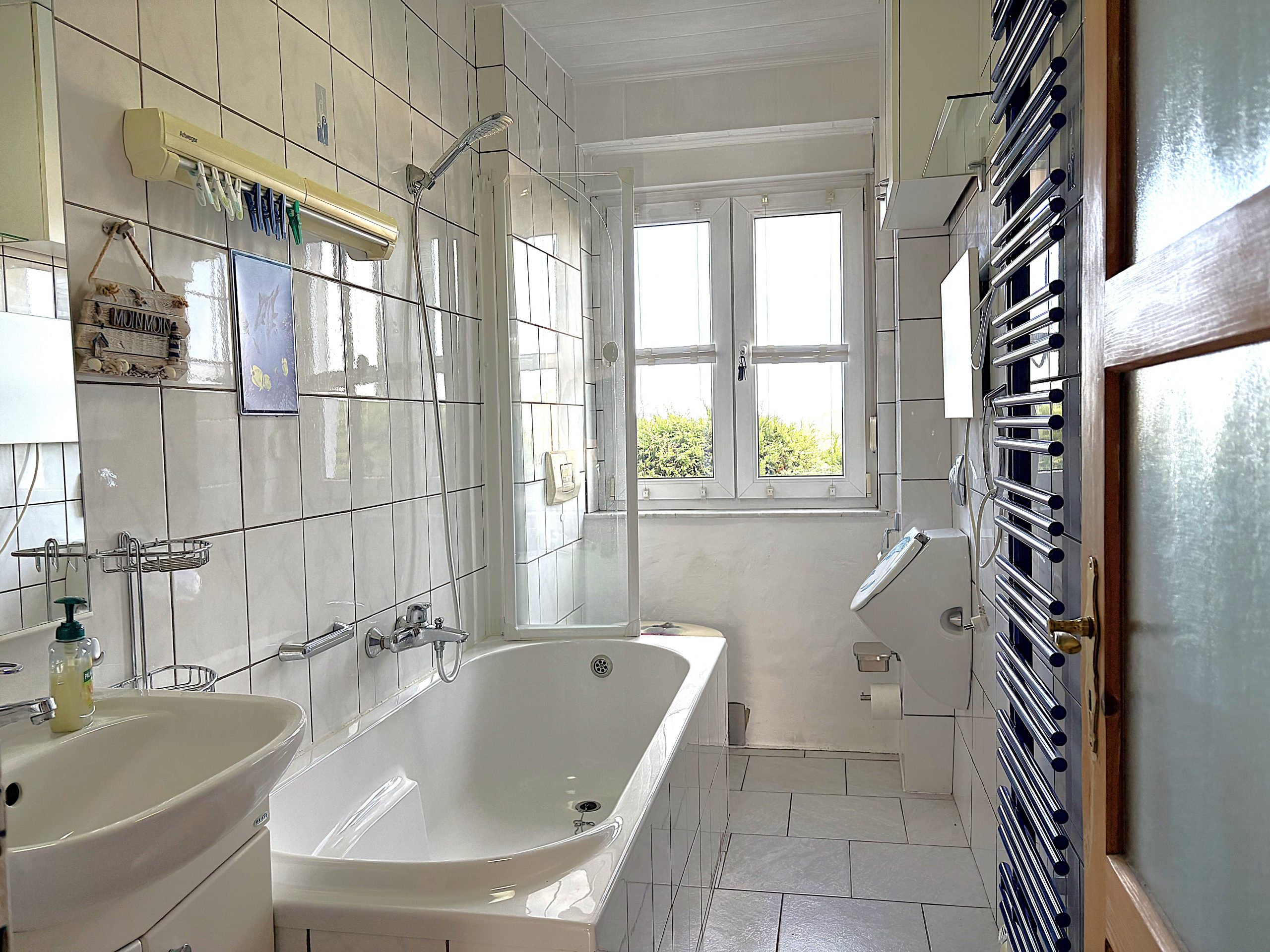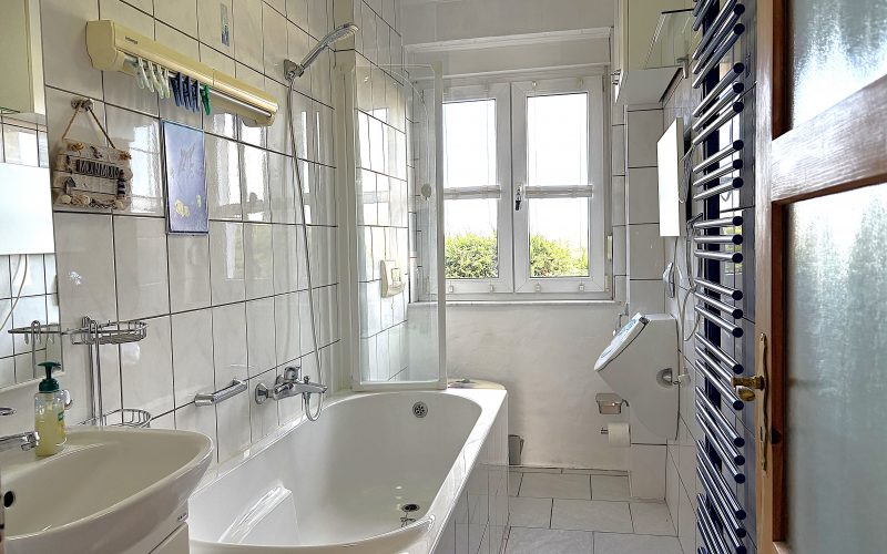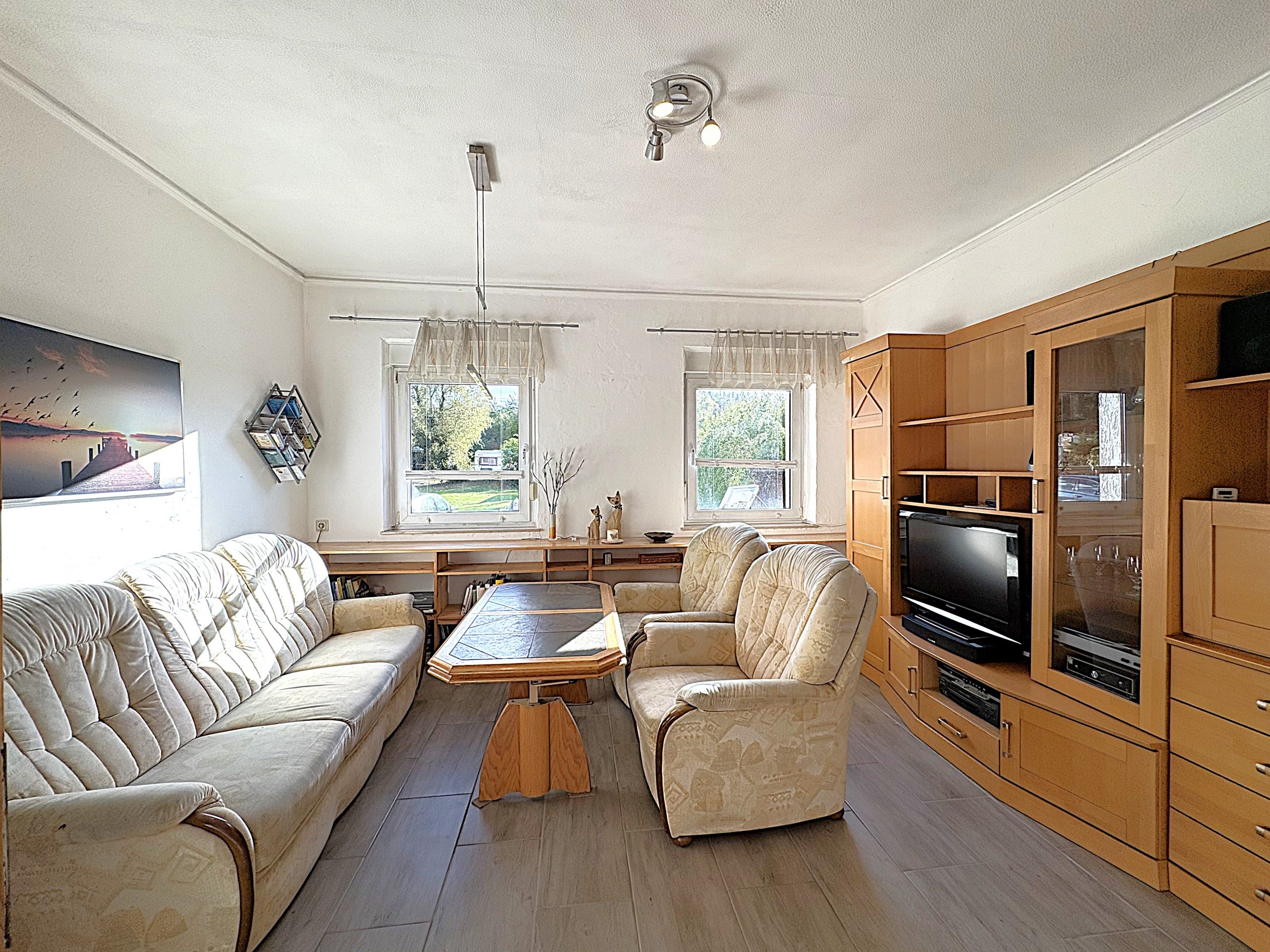 Die doppelverglasten Kunststofffenster tragen zur guten Energiebilanz bei und sorgen für ein komfortables Raumklima. Die Bodenbeläge aus Fliesen unterstreichen die langlebige und pflegeleichte Ausstattung.