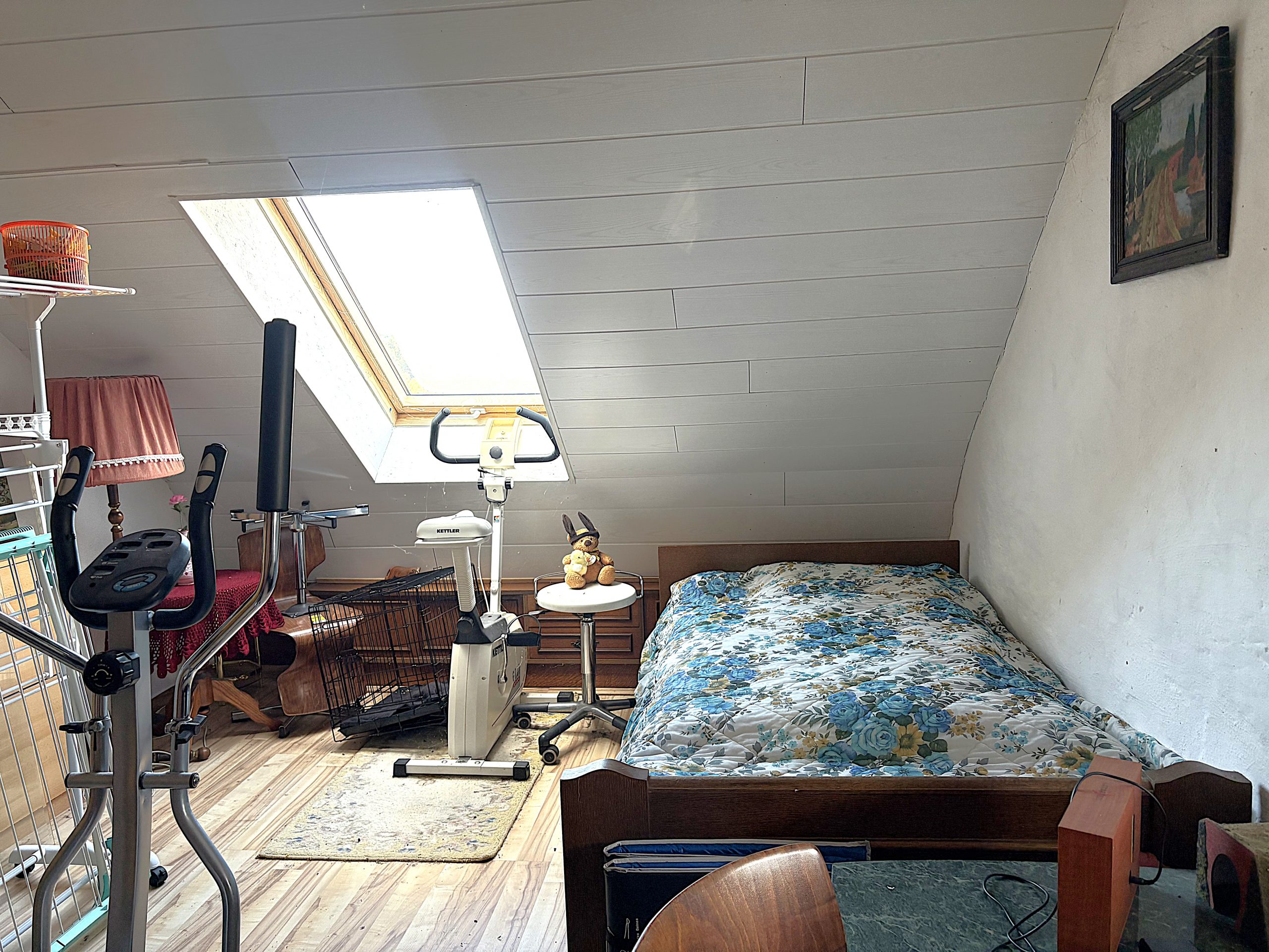 Ein weiterer Pluspunkt ist das separate Zimmer auf dem Dachboden des Hauses. Dieses zählt zwar nicht zur offiziellen Wohnfläche, eignet sich jedoch hervorragend als Abstell- oder Hobbybraum. Ein großes Dachfenster lässt viel Tageslicht in den Raum und sorgt trotz der Dachschräge für eine angenehm lichtdurchflutete Atmosphäre.