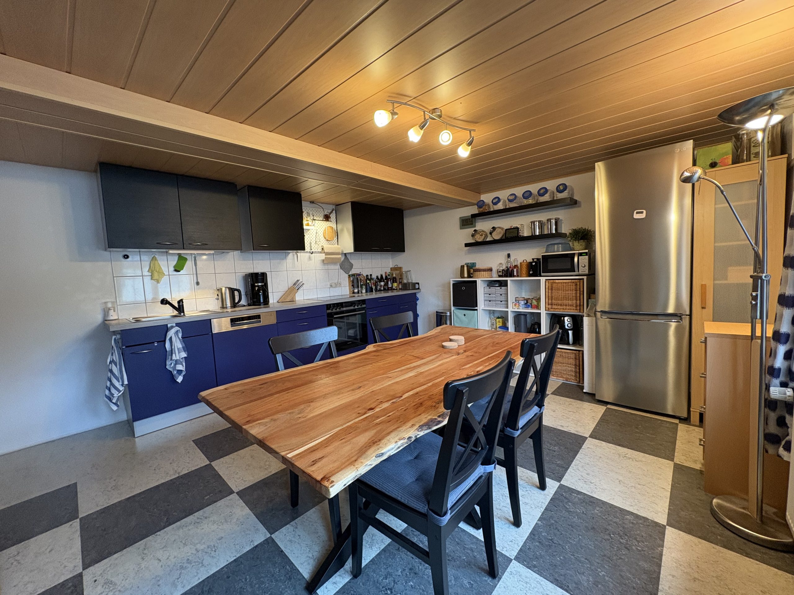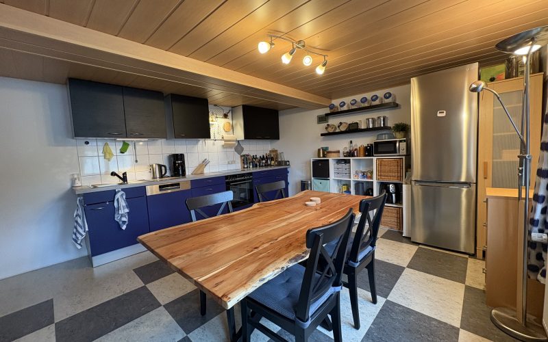 Über den Hauseingang gelangen Sie in die geflieste Diele des Wohnhauses. Von dort aus führt eine Treppe in den Flur des Erdgeschosses. Vom Flurbereich sind alle Räume des Erdgeschosses erreichbar. Hier gelangen Sie in die großzügig geschnittene Küche, welche mit einem hochwertigen ökologischen Fußbodenbelag sowie einer Einbauküche ausgestattet ist.