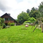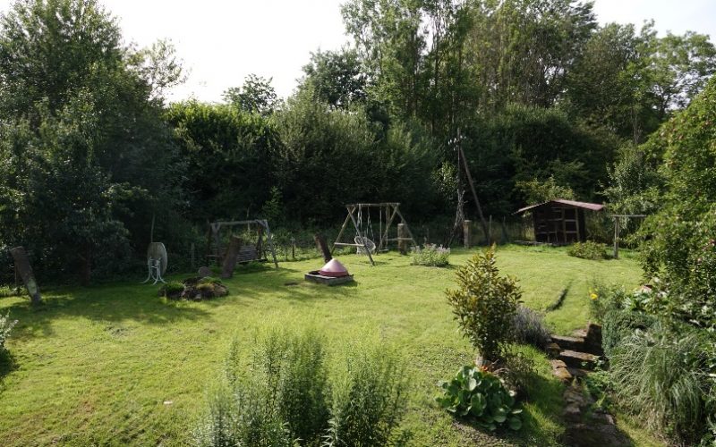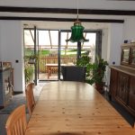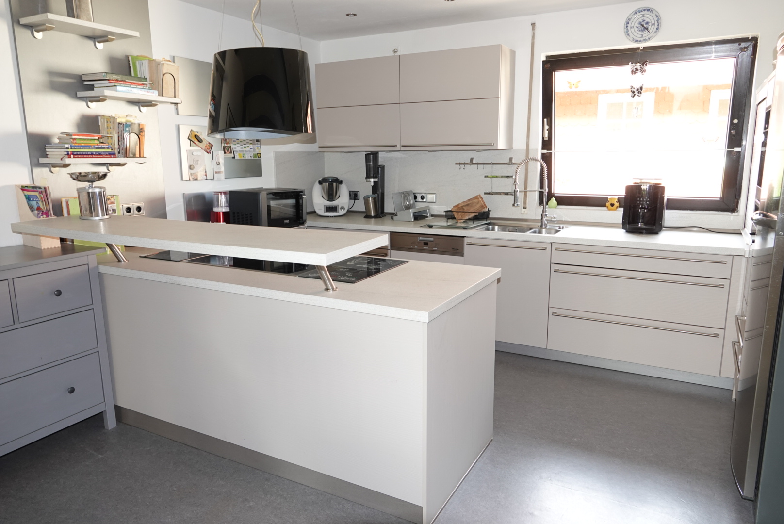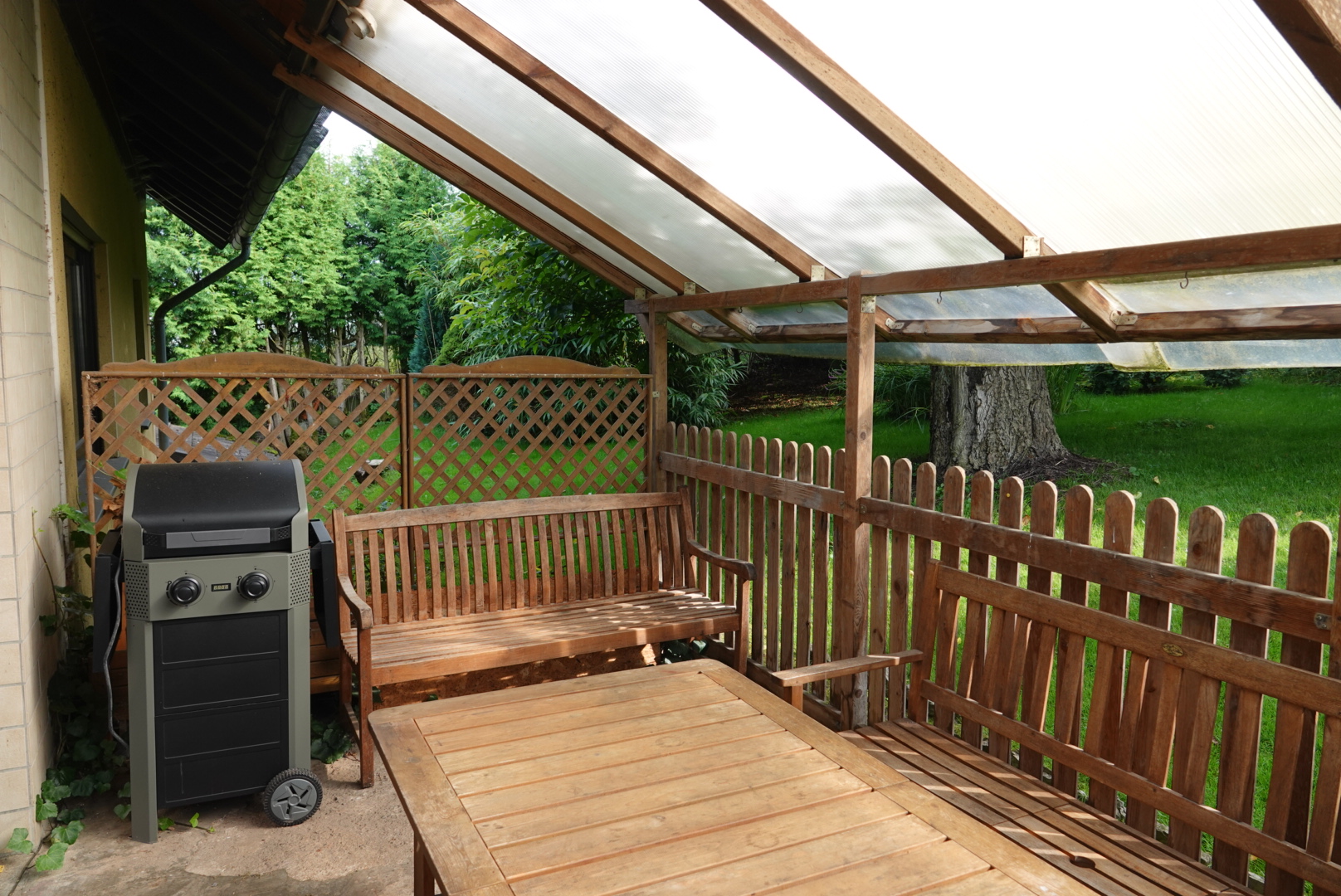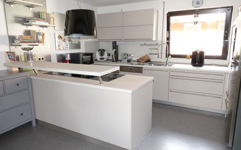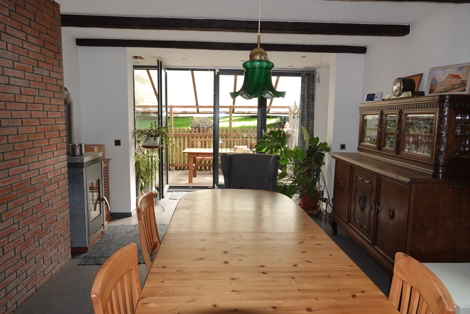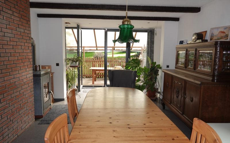 Im Erdgeschoss eröffnet sich auf ca. 106 m² eine äußerst gemütliche Wohnung mit viel Wohnkomfort. Herzstück ist der große Essbereich mit offener Küche und direktem Zugang zur überdachten Terrasse. Die moderne Einbauküche stammt aus 2013 und ist ebenso Teil des Angebots wie ein moderner Kaminofen. Das markante Fensterelement zur Terrasse – ebenfalls 2013 erneuert. Es öffnet den Blick in den romantisch angelegten Garten.