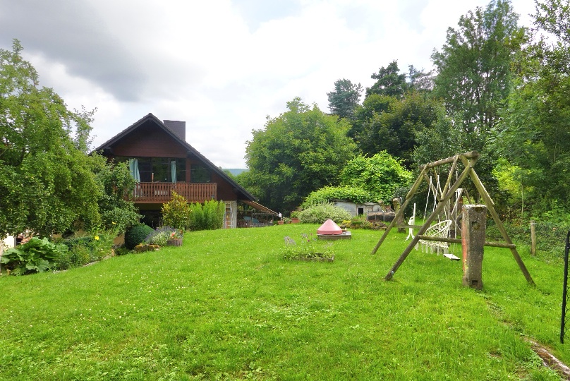 Im über 30 m² großen Wohnzimmer spendet ein ehemals offener, mit einem Heizeinsatz versehener Kamin, angenehme Wärme. Eine rustikale Deckenvertäfelung und ein seit mehreren Jahren nicht mehr zurückgeschnittener Walnussbaum vor dem Fensterelement, lassen den Raum momentan etwas dunkel erscheinen. Eine Säge und weiße Farbe dürften reichen, um Helligkeit in den Raum zu bringen.