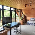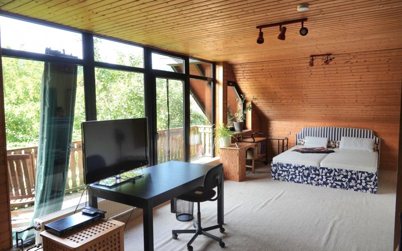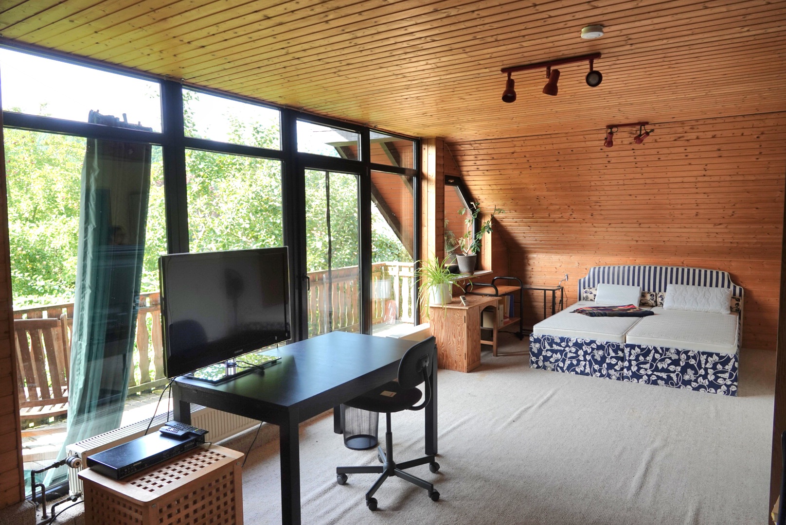 Das Dachgeschoss bietet auf ca. 74 m² ein weiteres Highlight: Ein Wohnbereich mit großem Panoramafenster über die gesamte Giebelseite sorgt für ein offenes, lichtdurchflutetes Ambiente. Vom angeschlossenen Balkon aus genießt man den Blick in den Garten. Zwei weitere Zimmer sowie ein modernes Wannenbad machen diese Wohnung besonders attraktiv für Paare, Kinder oder Gäste. Auf dieser Ebene sind Beschädigungen in den Gipskartonplatten sichtbar. Das ist nicht schön, aber für einen versierten Heimwerker machbar.