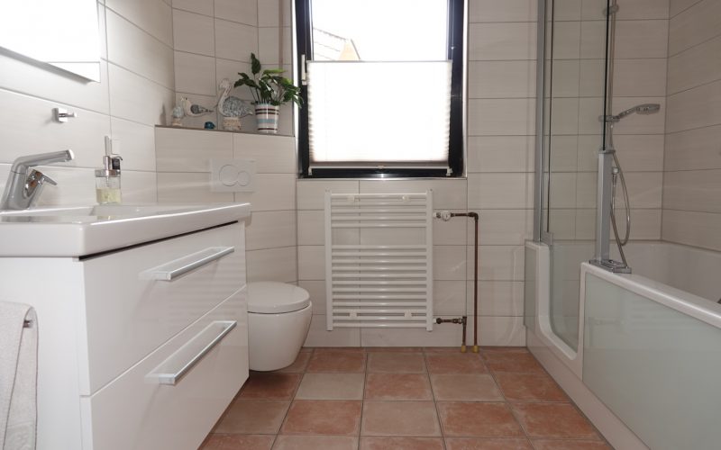 Ein wirkliches Highlight befindet sich im modernen, ebenfalls 2013 erneuerten Bad – eine begehbare Wanne. Ein Sanitärelement bietet somit beides, die schnelle Morgendusche und das erholsame Bad zur Entspannung. Ein separates Gäste-WC ist zusätzlich vorhanden.