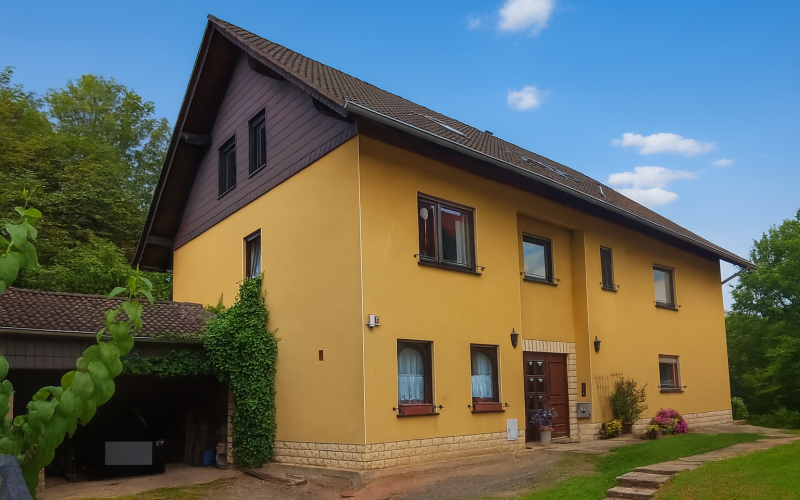 Dieses außergewöhnliche Immobilienangebot in Waldkappel-Harmuthsachsen verbindet großzügiges Wohnen mit vielfältigen Nutzungsmöglichkeiten. Auf einem sonnigen Hanggrundstück von rund 1.698 m² wurde Anfang der 1980er Jahre ein stattliches Wohnhaus errichtet, das heute durch den Ausbau von Sockel- und Dachgeschoss drei eigenständige Wohneinheiten bietet. Hinzu kommt ein zweites Haus auf dem Grundstück, das von einem handwerklich begabten Käufer zu weiteren ca. 100 m² Wohnraum entwickelt werden kann – ein zusätzliches Plus, das in dieser Form äußerst selten zu finden ist. Äußerlich ist es in einem erstaunlich guten Zustand, muss im Inneren jedoch vollständig saniert werden.
